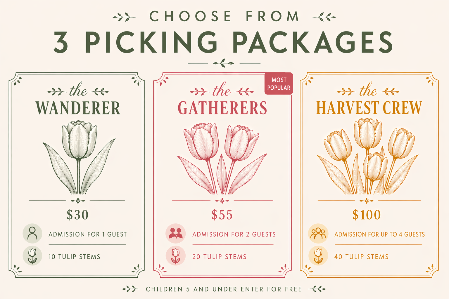 Pick-Your-Own Tulips will proceed rain or shine. No refunds and exchanges will be provided for no-shows. All ticket sales are final . Please note that each ticket is only valid for the date listed/purchased.